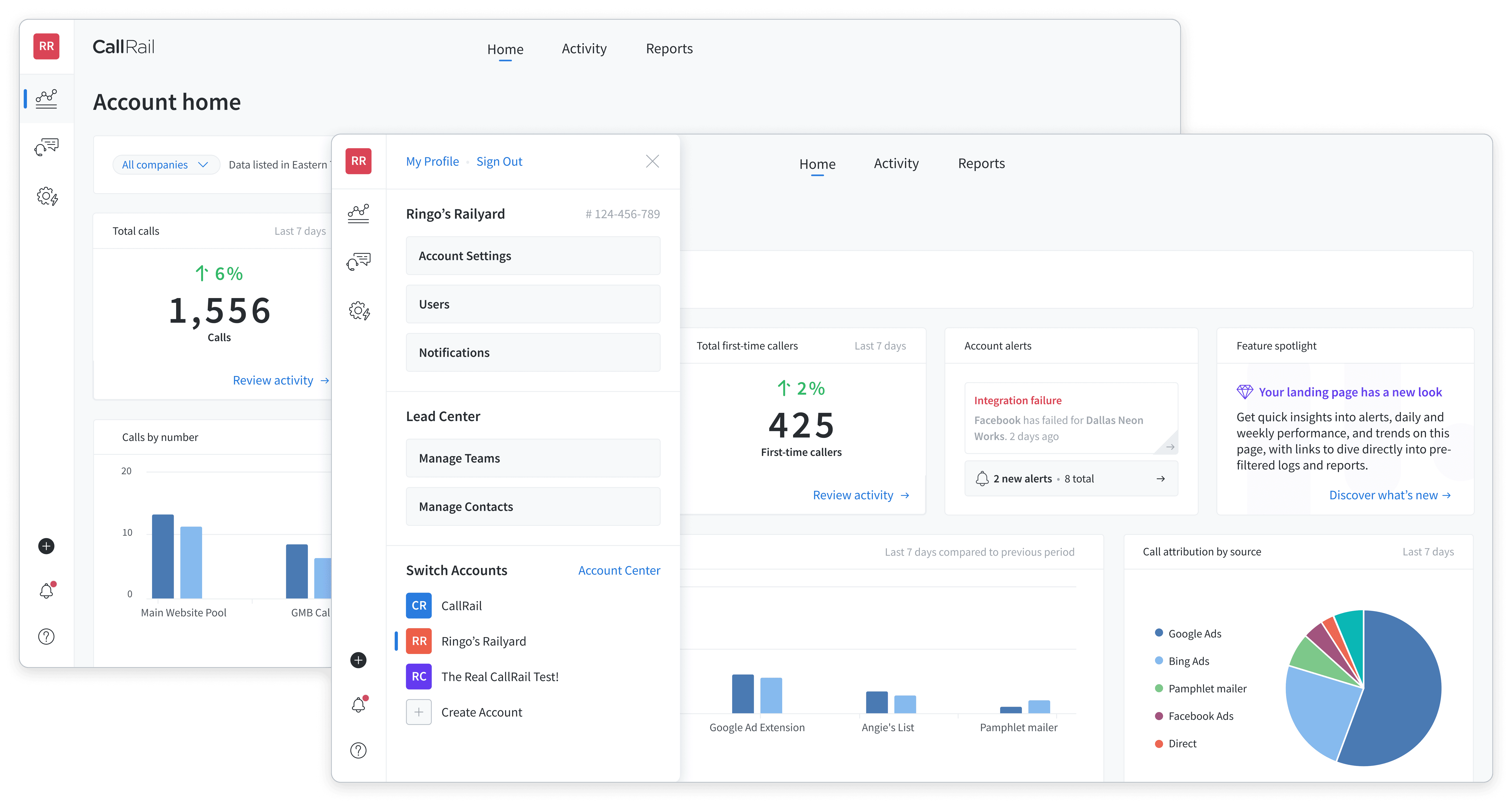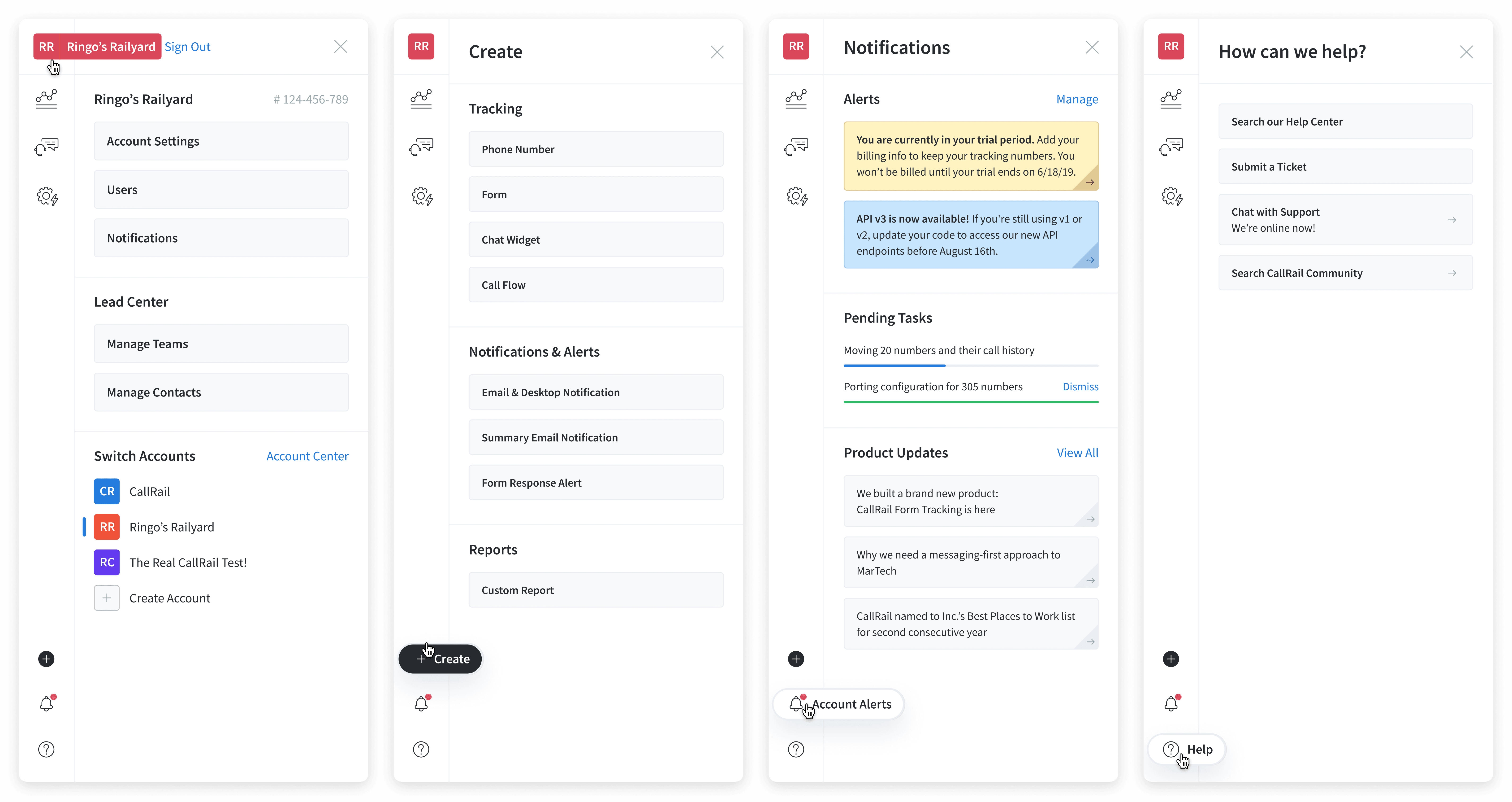 During early explorations, my director asked me to also explore ways to improve specific experiences such as switching accounts, which was a part of our existing navigation. If we were rethinking the general structure and UI, it made sense to explore related interactions and how those might be affected. Where this lead to was imagining an entire new panel pattern that could be opened adjacent to the new vertical global nav bar. The additional real estate and easy reusability made this a prime candidate for not only improving account switching, but other interactions stemming from our primary navigation: quick create menu, help menu, profile, sign out, and new opportunities such as surfacing account details and notifications.